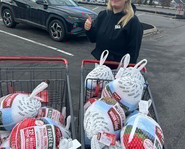 On 11/21/25, Megan prepared turkeys for our Thanksgiving giveaway. We delivered Thanksgiving meals to the community. We don't just get people their permits and licenses. We are trusted members of our community and support one another on or off the road.